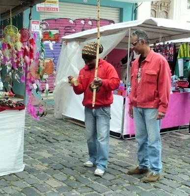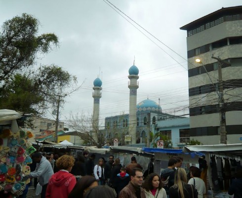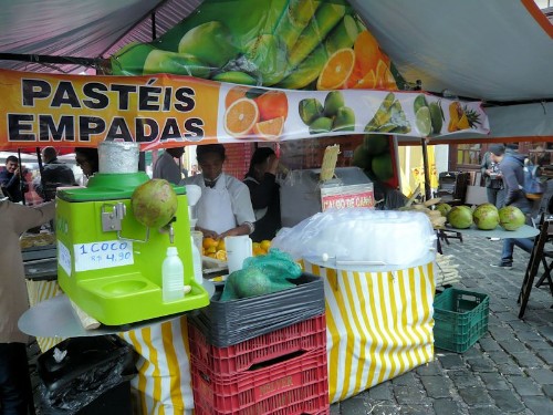 The following morning I bid goodbye to my friends, who returned to the US, as I stayed behind to spend an extra day in Curitiba and go to the city’s Craft Market, the largest in Brazil. I asked the hotel clerk to call me a cab, telling him I wanted to go to the Craft Market. A cab arrived with a driver who spoke only Portuguese; she seemed to understand where I needed to go, based on her conversation with the hotel clerk. Fifteen minutes later we stopped in front of the Municipal Market, which sells produce from around the world; whereupon I realized that my intended destination had been lost in translation. Fortunately the cab had an iPhone attached to the dashboard and, with Siri as our interpreter; I was able to communicate where I needed to go. Reluctant to take the car near the crowds, the driver dropped me off at Rua das Flores, pointing the way.