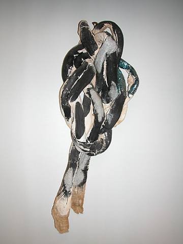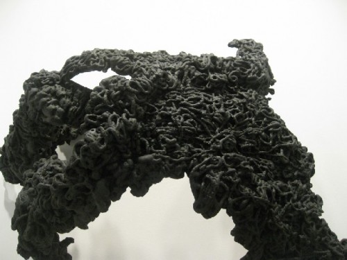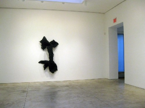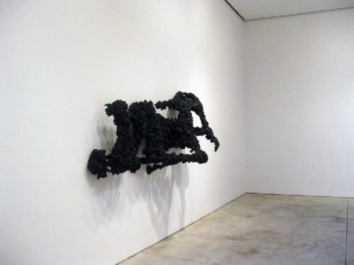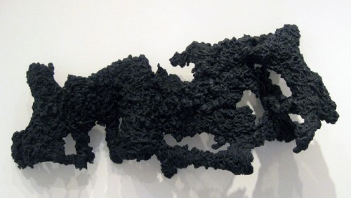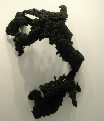 This new display at Cheim & Read continues the issues and themes of her practice. Yet again, she is working with free form, abstract, relief using experimental materials. Some are dark, black and seemingly weighty. Upon close inspections they seem to be created by snarling and knotting masses of rope. There is the illusion that some material has been poured over to solidify them. But when nobody was looking a quick tap test revealed that they are likely to have been cast in metal.