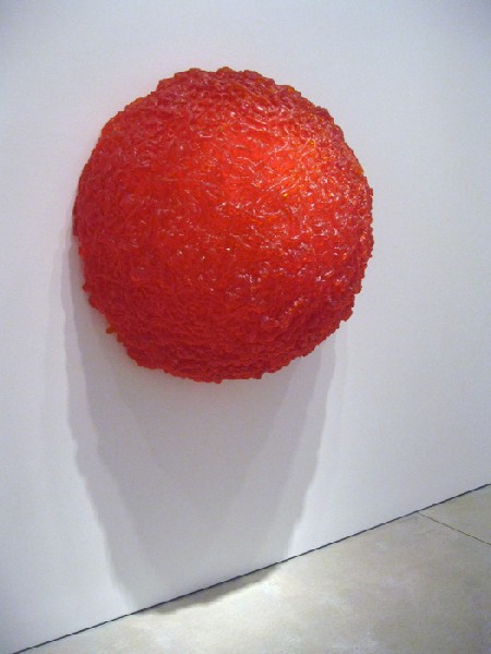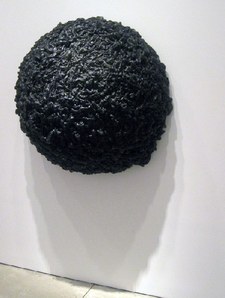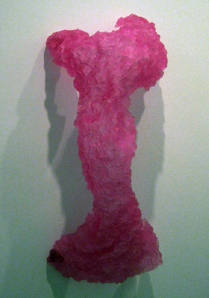 If these are the "serious" works there are also examples of brightly colored pieces in pink resin. We assume that these are the playful, gay, or feminine (not feminist) works. Pink is so girly and Barbie. Where the black pieces conform to no geometry the pink ones have half spheres as their shape.
