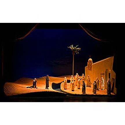 On every level the performance of "Thais" was enthralling. We were absorbed from the first moments of the opening scene. The set revealed a stark, barren, desert settlement of Cenobite monks. The stage undulated in a simulation of sand dunes marked by angular light. The leader of the monks is prevailing on the sanguine Athanael not to interfere with the affairs of man. But he is driven to grapple with evil and save the soul of the courtesan of Alexandria. Against all advice he departs for the city. There he finds the house of a former classmate and friend, Nicias (Michael Schade). It appears that Nicias will dine one more time with Thais. At great cost he purchased her companionship for one week so, clothed in finery from Nicias disguising his robes, Athanael, will confront her that night.