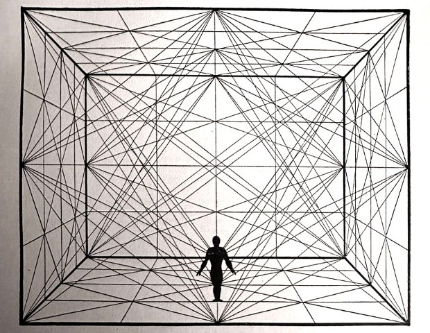 While Schlemmer’s drawing inscribes a three-dimensional space, this sculpture (whose dimensions are 18”x16”x5”)** clearly evokes, instead, the bi-dimensionality of the drawing itself. Further, by adding a graphic dimension to traditional sculpture, the work previews an early Minimalism. The anonymous artist doesn’t only follow the structure of Schlemmer’s drawing but also the spirit of the text accompanying it: on giving physical presence to “the cubical space” as an “invisible linear network of planimetric and stereometric relationships”, he builds a sculpture of pure geometry as we have seen it fully practiced in the early 1960s. In addition, by placing the human figure, molded in an expressionist mode akin to that of Alberto Giacometti’s works of the 1940s and 1950s, at the center of a universal space, he seems to follow Schlemmer’s coupling of the “laws of cubical spaces” with the “the laws of organic man […] invisibly involved with all these laws […] Man as Dancer (Tänzermensch). He obeys the laws of the body as well as the law of space: he follows his sense of himself as well of his sense of embracing space”, as illustrated in a drawing on the following page 14 of Die Bühne im Bauhaus. In not limiting him or herself as an epigone: the anonymous Bauhaus disciple pushes his master’s imagination further, making his work inspired by Schlemmer’s drawing not merely the illustration of an idea, but an idea itself, anchored not in the physical world but in a metaphysical realm.