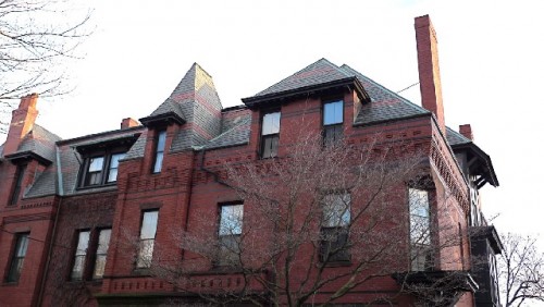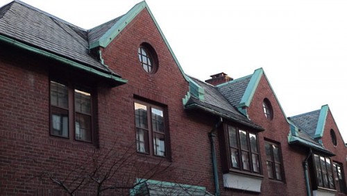 Unusual Building detailing and Roofline on three conjoined houses at 8,10 and 12 Aberdeen Street, Boston, MA. Notice the round windows and copper edging.