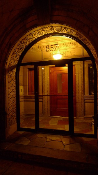 Nighttime image of door and wrought iron at 867 Beacon Street, Boston, MA