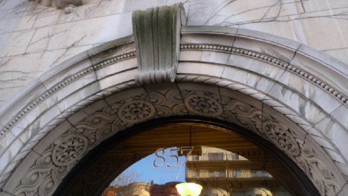 Romanesque carved detailing on archway at 857 Beacon Street, Boston, MA, c.1885.