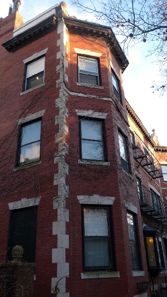 At 853 Beacon Street, there is an ornately carved cornice frieze. Adjacent to this is a different frieze design carved into 855 Beacon Street. However, they both appear to be done at the same time.None of the other brownstone buildings on that part of Beacon Street have similar decoration. A short block away, on 867 Beacon Street, a bulding owned by Boston University, there is a unique bay window encapsulated in a beautifully stained green copper sheathing. There is nothing like this anywhere else in Boston. What was the architect or builder thinking?