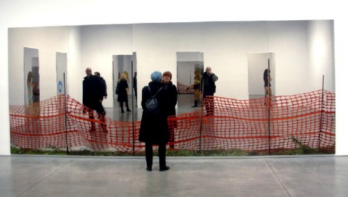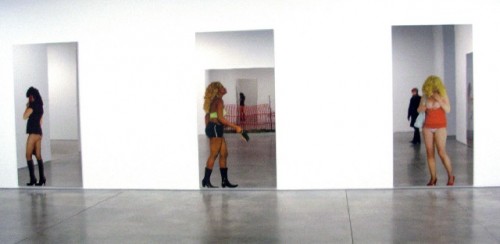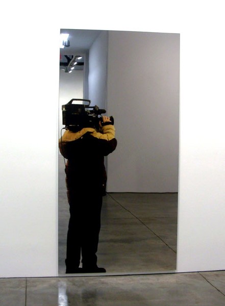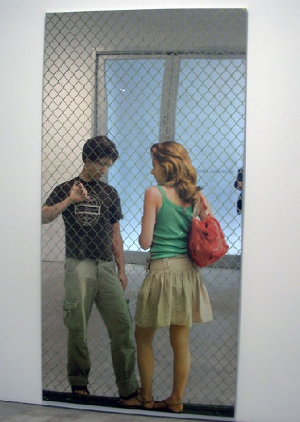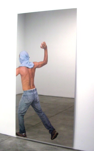 The images on the mirrors are just real enough to lure us in. As we stand before the works they make interesting companions particularly the sexy women teetering on spike heeled boots or crouching in underwear. They encourage erotic fantasies on the part of male viewers. In one work we encounter the profile of a television news camera man. We are welcome to be a part of that event. Or a young man, perhaps a radical protester, hurling a rock during an ersatz demonstration. One side of the gallery entails a very wide work with the bright orange illusion of a fence surrounding a construction site. This work allows for a broad panorama of the surrounding works.