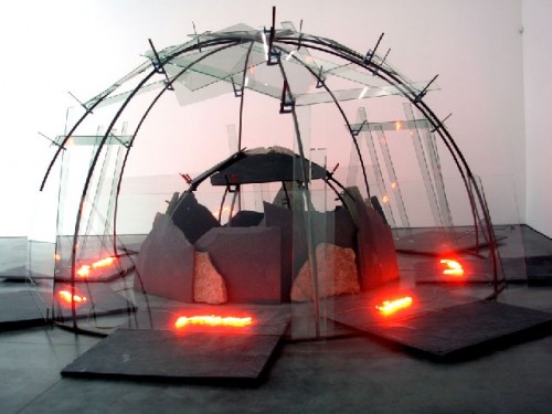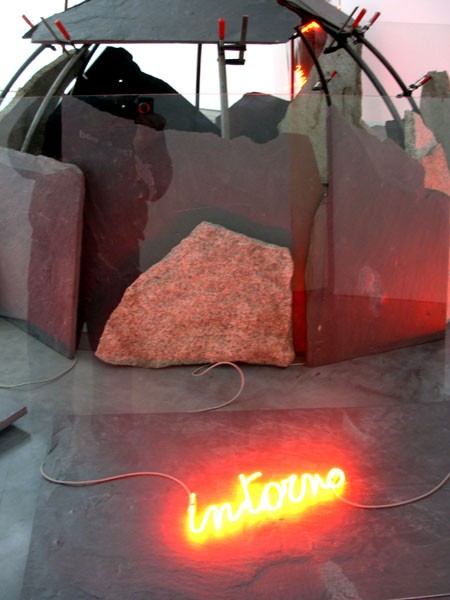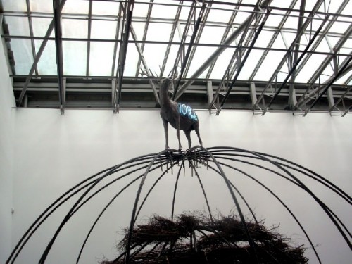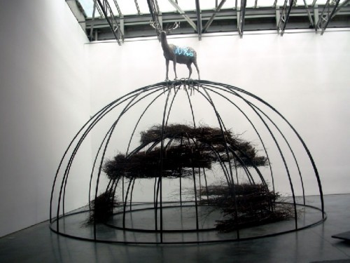 Many artists who have subsequently embraced Duchamp's inventive and whimsical use of materials have not necessarily subscribed to his radical strategies. During our recent tour of Chelsea galleries, for example, we encountered large sculptural works by another Arts Povera artist, Mario Merz (Born, Milan, January 1, 1925 died, November 9, 2003). These were his typical, Igloo pieces, which entail variations of a steel armature into which are inserted such elements as large sheets of stacked glass, slabs of slate and stone, large clamps holding elements together, bundles of sticks, numbers and words written in neon. On the top of one of these sculptures is a life size deer. Variations of works with these materials have been widely encountered in international exhibitions.