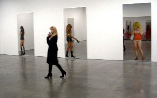 It makes a difference whether the gallery is empty or full of visitors. When the room is vacant the installation becomes quiet and static. But when someone walks through, particularly an attractive, interesting person, the space becomes quite lively as the moving figure bounces off and activates the many reflective surfaces.