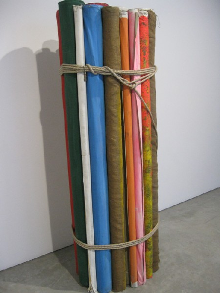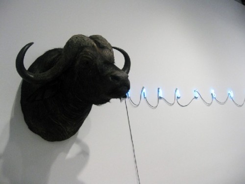 There was an atypical work by Richter, a shirt. Hmm. A vertical bundle of rolls of fabric was created by the Italian Arte Povere artist Pistoletto. Earlier in the season he showed new Mirror pieces at Luhring Augustine. Another AP artist Merz is represented by a stuffed buffalo head high on a wall with a string of neon squibbles spreading out horizontally.