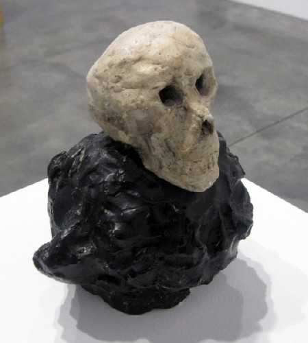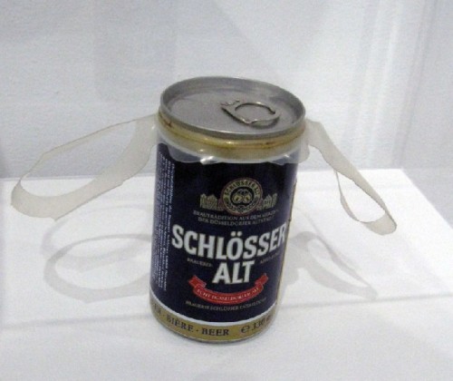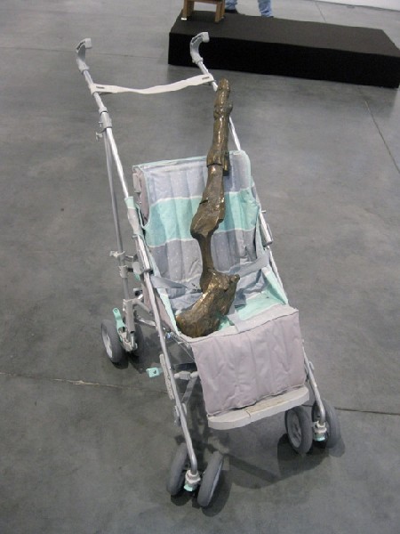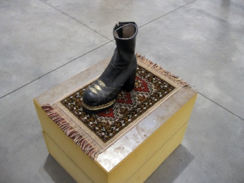 I have an irrational passion for all aspects of the work of that bad boy German artist Martin Kippenberger. The work was wildly uneven but when wide of the mark he was always provocative and absurd. Here there are three typical works. In one a bronze cast of a pig's leg is displayed as an ersatz baby in a stroller. Another is a tin of beer displayed with its plastic ring as a reduced six pack. The third shows us a single boot on a tiny bit of carpet.