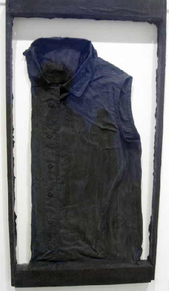 On the other hand, yet again, the works by Arman, typically vitrines filled with stuff, seemed glib and slight. He seems to be the Peter Max equivalent of Dada. Here we found a wall piece with gas masks meaning just what? More provocative was a vertical vitrine alleged to hold the garbage and trash of Raushenberg. It is a page taken from the game plan of A. J. Hoberman in the 1960s. He documented and published the content of trash collected from the street in front of the homes of Dylan and other celebrities. Here Arman reveals that Rauschenberg's refuse included a significant proportion of empty liquor bottles. Let us not speak ill of the dead.