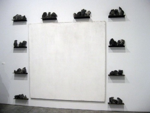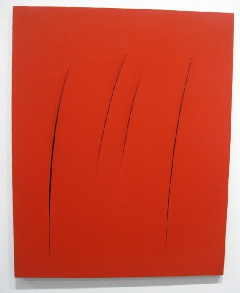 Tinguely is represented by assembled junk sculptures. But this time not kinetic. The polarity of ancient and younger women is represented by a vintage work from Bourgeois and a newer one by Trockel. A large wall piece in elements of shelves surrounding a large blank canvas by Kounellis is typically confounding. While a bit of nothing by West evokes little or no response. Again a slashed canvas monochrome by Fontana delights me but annoys my artist friend Harry. He regards the artist as signifying everything that is wrong with art nowadays.