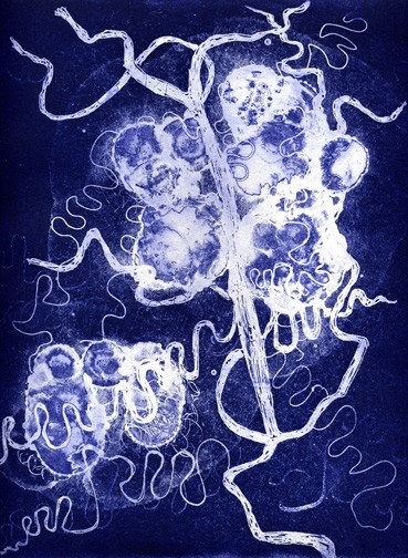 Andrew Carnie (b. 1957), a British conceptual artist, demonstrates the birth and differentiation of brain cells (neurons) in his installation Magic Forest (2002). Jessica Rankin (b. 1971), an Australian artist inspired by "mental maps," explores ideas of memory, intuition, and interpretation using embroidery on large-scale pieces of organdy.