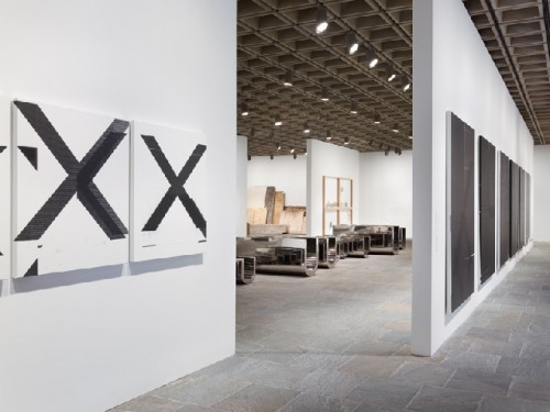 “Uninterested in drawing by hand, much less in wielding a paintbrush, he describes himself as someone who makes paintings but does not consider himself a painter. His vocabulary of dots, stripes, bands and blocks, as well as much enlarged X’s and U’s and occasional scanned images, combines the abstract motifs of generic Modernism and the recycling strategies of Andy Warhol and Pictures Generation artists like Richard Prince and Sherrie Levine,” she continues.
