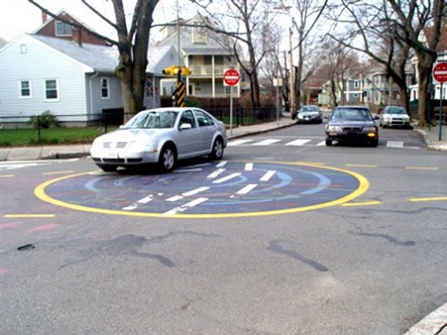 After a few weeks, cars seemed to be driving over the circle rather regularly and messing up the painted design. The mural circle seems to generate traffic back-ups which are more than just slow-downs. Over time, the project will demonstrate whether or not this was a worthwhile traffic calming and public art experiment.