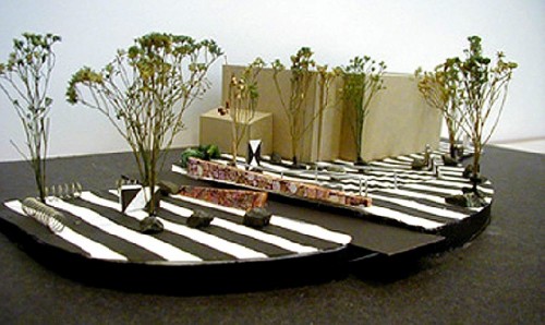 The project presentation model is elegant and visually resolved. However, the completed project includes a heavy handedness exemplified by clunky functionally necessary utility boxes. Strangely, the whole project seems much truncated. Pedestrian use of it seems unclear and even clumsy. Here, the tidy model apparently was created in a vacuum leaving out reality issues. Instead of simplifying the plaza, the project adds confusion by adding visual clutter. Did the artist ever do any real site studies or work with the Department of Public Works to test anything real before installation?