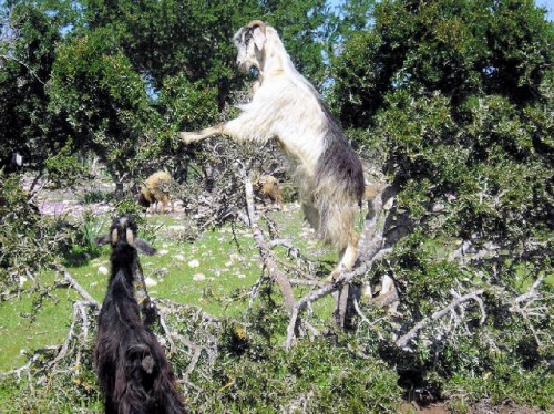 The visit to a grove of argan trees to see the goats feeding was delightful. Big and little goats stood on their hind legs to reach the fruit and climbed the branches to get to the ones higher up. Easy to spot in their shaggy brown, white and black hair, they allowed me to get close to take pictures as they continued eating. It seems they were accustomed to being photographed for they appear on many postcards. Afterwards by the beach, we enjoyed shish kebab cooked over a charcoal brazier and seasoned with cumin.