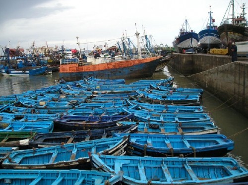 Berber herders waved to us as we resumed our trip. Children came running to earn a few dirhams in exchange for a photo op. We drove by plastic-covered greenhouses, surf breaking on the shore, and tombs scattered in the fields. When we reached Safi, a coastal town whose major industries are phosphate and sardines, the landscape changed into one of earth-toned houses with bright colored doors and window frames. Flat roofs featured green tiles and slender chimneys. The weather felt much warmer as the blooming mimosa and hibiscus trees came into view. We stopped outside the main gate of the Essaouira medina, the walled medieval city, as vehicles cannot negotiate its narrow streets. Porters unloaded our luggage onto two wheeled carts, which they pulled by hand through the narrow streets to our hotel. Its massive gate did not reveal what lay beyond.