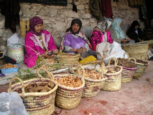 In the afternoon we visited the Argan Oil Cooperative, which benefits poor women. The Argan, native to Morocco, is similar to an olive tree. Goats eat the fruit; the pits are used to process oil for cosmetic or medicinal purposes. By hand women skin the fruit, crack the nuts, roast the seeds, and then squeeze them to get the oil. The pits are either roasted or cold-pressed, depending on the intended product. After sampling the delicious almond paste mixed with argan oil and honey, we purchased some along with salad oil and soap.