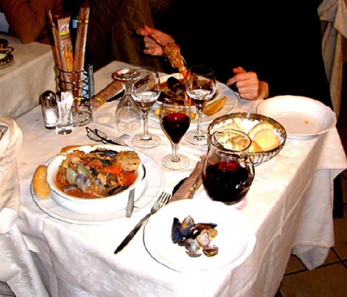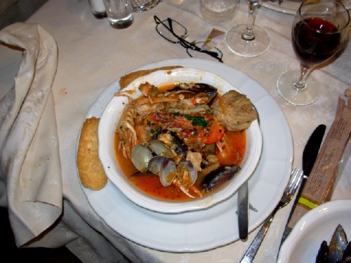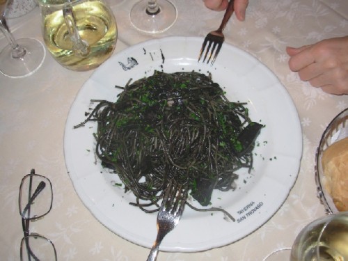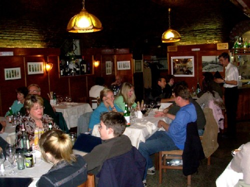 On our first night we just showed up at the Taverna and waited for the doors to open. We were lucky to get a table up stairs as the restaurant was full in a matter of minutes. I grabbed the host and made a reservation for the next few nights. As "regulars" we got great seating on return visits and came to know the range of the marvelous menu. On the recommendation of Grace I tried the zuppa de pesce which was flavorful and well stocked if a bit overcooked. Astrid had similar comments about an order of several grilled varieties of seafood. The side of artichoke hearts was superb. On another night I enjoyed a delicious osso bucco, one of my favorite dishes, and recommended it to Horst. The linguini carbonara was terrific and memorable. But the most unique and sensational delicacy was the pasta nero, or black pasta, served in octopus ink. It's a bit gamey, and perhaps an acquired taste, but certainly is not to be missed and a specialty of the house.