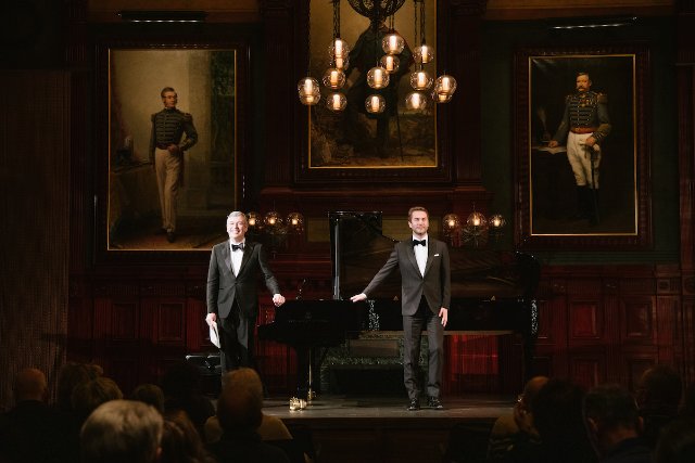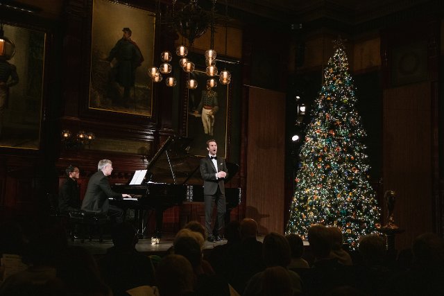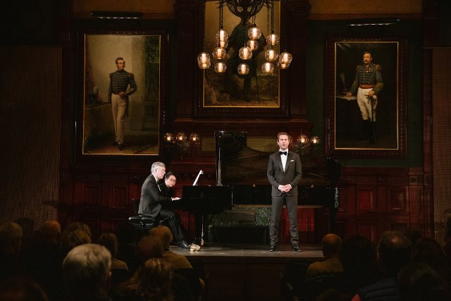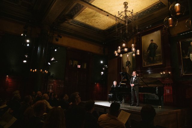 At first Oliemans explored the sounds of his voice in the room, which is so much smaller than the opera houses where he performs in Peter Grimes and Hansel and Gretel. Yet his voice sits well in the beautiful Officer's Room of the Armory. Sometimes the resonance of the room's walls was tested. At others, Oliemans murmured phrases stood out in the quiet space.