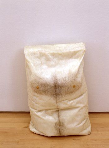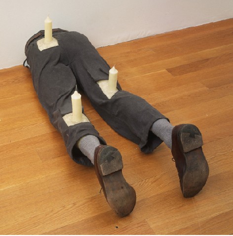 For me they were still sinks, piles of “printed” newspapers, legs sticking out of walls with candles attached or inexplicable cavities. Reading up I learned that those circular excavations on bare parts of legs attached to briefs were references to the marking of Kaposi's sarcoma.