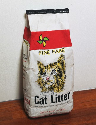 As the artist became more successful there was the inevitable ratcheting up of ambition. Exhibitions of those simple enigmatic objects transformed into room engulfing installations with wallpaper and “things” attached to, leaning against, or coming out of the walls. Critics have gone deep on the meaning of bags of kitty litter, rat poison or wallpaper with repeated small, crude drawings of a sleeping man or a lynching. Other motifs contrast images of male and female genitalia.