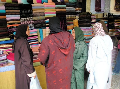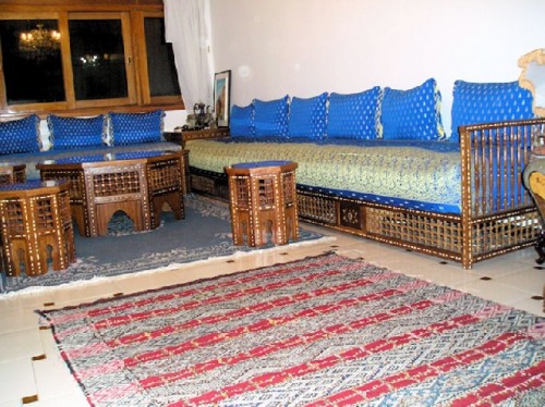 In the evening we split into three groups for our home-hosted meal. Our group of four rode in our host's VW to the complex where he owned a two-bedroom apartment. His wife and three children, a boy and two girls aged two to eleven, met us at the door. Our hostess, in traditional garb with headscarf, offered us mint tea in the living room, while the oldest child, the son, finished his homework with assistance from his father at the computer. Then we gathered around a low table in the dining room for a meal of harira (thick vegetable soup), padiljan (eggplant) and tajine of chicken, which we tore up with our fingers from a centrally placed platter. Eating in this fashion minimizes the number of dirty dishes and is easy to clean up by shaking out the plastic tablecloth cover.