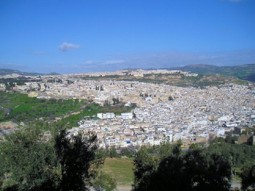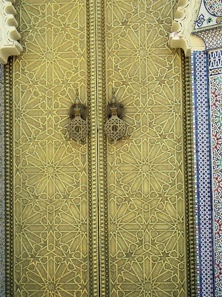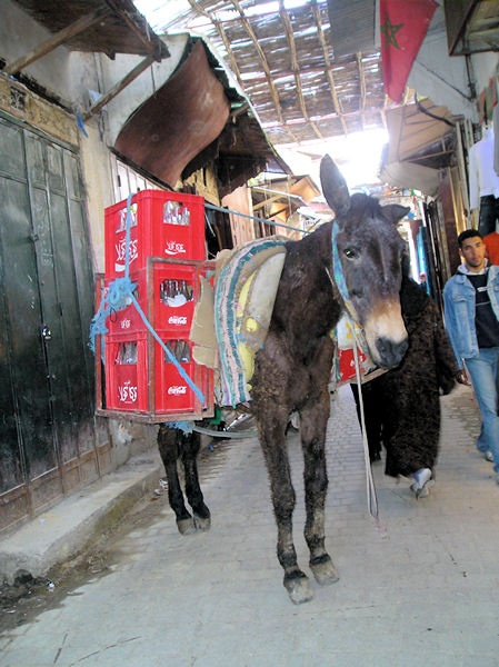 The next day we began with a panoramic hilltop view of the city, the two parts of which are connected by a bridge over the Fez River. We visited the royal palace and explored the Mellah, the old Jewish quarter, before plunging into the Fez medina, the most well preserved medieval city in the world. Designated by UNESCO as a World Heritage Site, the medina is made up four quarters and many sub-quarters, housing 500,000 people within 64 square miles. Entered through nine gates, it is a labyrinth of 9000 crowded alleyways with 850 dead-ends and 600 craft shops. It has 300 mosques. The most often heard word is balek "watch out", as donkeys loaded with goods come through the alleys.
