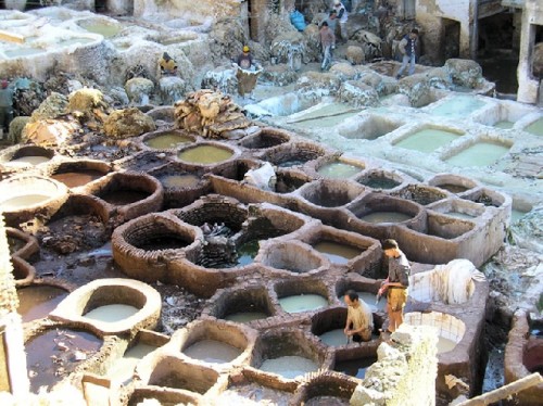 Following a visit to a carpet cooperative, where we saw both antique and new Berber and Fez rugs, we went to the tannery. On the way we munched on fresh baked bread and picked up sprigs of fresh mint to counter the odor of the tannery. From a bird's eye view of huge vats, we watched goat, sheep and camel skins first soaked in lime, then treated with pigeon droppings as men agitated the solution standing knee-deep in rubber boots, and finally hung to dry. At the end of the day we had seen only one fourth of the medina.