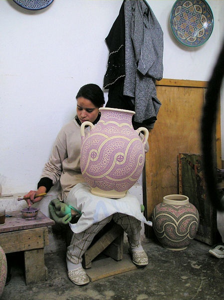Fez is known for its blue ceramics made of gray clay unique to the city. At the ceramic shop we watched potters at wheels, kilns fueled by olive pits, and women glazing pots. Artisans made tables by cutting and chiseling mosaic into small shapes and arranging them into designs as they placed them face down, then pouring cement to hold the pieces when hardened. Finished square, round and half-moon-shaped beautiful tables of various sizes on wrought iron legs of different heights beckoned to be bought.