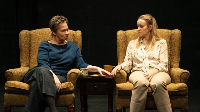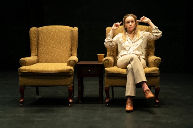 Hilda (Emily Cass McDonnell) addresses us directly as The Thin Place begins. She sits in a wing-backed chair, one of two. The second one stares at us, empty. Hilda is thinking about her grandmother, who used to sit on the floor, scribbling words on small pieces of paper which she would hold close to her chest. She asks Hilda to listen carefully and see if she can hear the word. Hilda guesses. The grandmother says she's wrong.