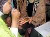 Our volunteer groom's white silk outfit included a bag and a dagger to show his manly qualities; the bride's white lace dress had a red veil. The couple and two witnesses sat before the imam, while he wrote the contract noting the promised dowry items. Following the signing the groom lifted his sword to unveil the bride, to great applause by all.