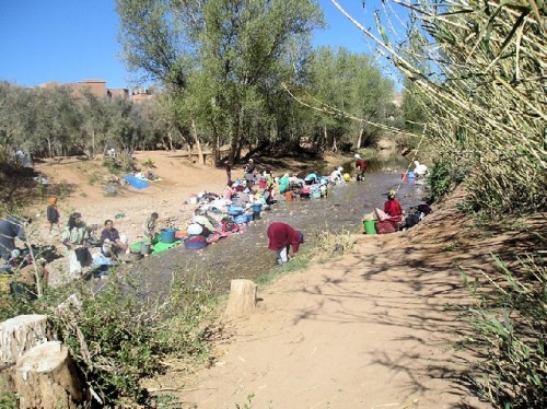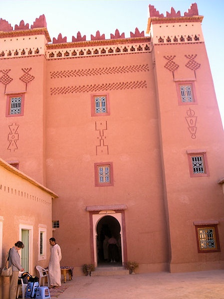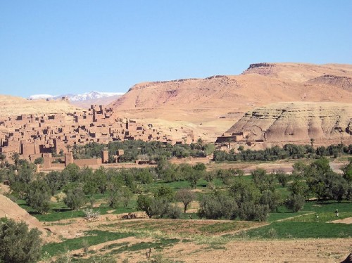 On our way to our next overnight stop, Quarzazate, we drove to Dades Gorge, shaped by the river that irrigates the Dades Valley. Admiring emerald green fields and fig trees we climbed to 7350 feet passing breath-taking peaks, valleys and giant sandstones, which locals call "the brains of the Atlas". Blended into the mountainside, red clay mud houses with windows small enough to let the light in distinguished themselves by their colored doors. Young girls with head covers carried big bundles of firewood and animal feed on their backs. The slogan "Western Sahara is ours" stood out against the mountainside. We stopped at a Sunday market crowded with goats and sheep sold for breeding. Bargaining was brisk and animated. Since Friday is a holy day, Sunday is a big market day.