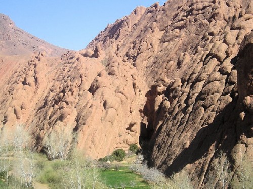 By bus we drove to the oasis town of Tineghir crossing, at 4000 feet the Anti Atlas Mountains, which face the High Atlas. The terrain turned into mossy slopes with goats; rocks became boulders. Set against the crest of the mountain, Tineghir matches the pinkish glow of its surroundings. Buildings have flat roofs, with turquoise- or blue- framed doors and windows. When adobe houses deteriorate new ones go up. Settling here overnight, we washed off our desert dust and welcomed the altitude- tempered warmth.