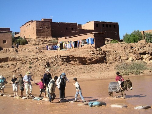 The seven-hour drive to Marrakech had planned stops of interest. First was Ait Benhaddou, formerly a caravanserai for traders en route to Timbuktu. The citadel-like structure on the side of a mountain provided protection from the Blue Men. To get there we crossed the river skipping on sandbags, passing by locals in the water on donkey back. We climbed to the Agadir, the fortified granary at the top of the citadel built for secured protection. A typical construction of old Moroccan earth architecture, it is still in use for scenes from films such as Lawrence of Arabia and other classics that have been set here.
