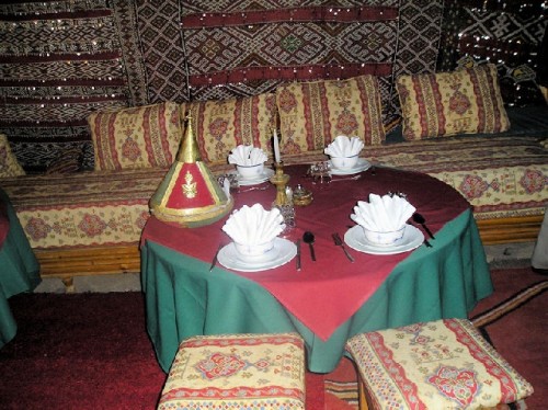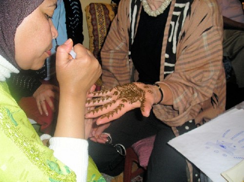 At a local home visit we had a demonstration of the regional henna custom for adorning women, especially new brides. The henna plant is native to North Africa. Crushed and powdered dry leaves mixed with water make a thick paint, which is applied to the hand with a syringe to draw designs. After the painted palm is dried over a brazier, the henna is fixed by sponging onto it a mixture of crushed garlic, lemon juice, sugar and pepper. Scraped the next day, the palm reveals a deep orange design. Six of us picked a traditional pattern from among several and had our hands adorned. Mine had a big eye in the center to ward off evil; it lasted about two weeks and wore off. In keeping with our distinctively Moroccan accessory, we had dinner at our hotel under a nomadic tent, which was totally covered with carpets from ceiling to floor, with mirrored ones on the walls.