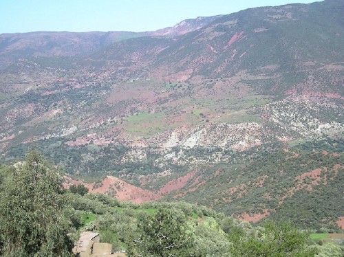 Our scenic climb of twisted roads with hairpin curves turned more spectacular with altitude: purple, rust and ochre-colored hills, almond blossoms, green river beds, flocks of sheep in high pastures, wool dyed deep red and saffron hung to dry. My ears began popping at 7000 feet. We stopped at a Berber village for lunch. Flowering rosemary plants lined the restaurant's terrace, which had an area sectioned off with colorful prayer rugs. Sipping mint tea as I gazed across luminous mountains, I reflected on the Berber love of beauty, and how they found inspiration in their natural surroundings.