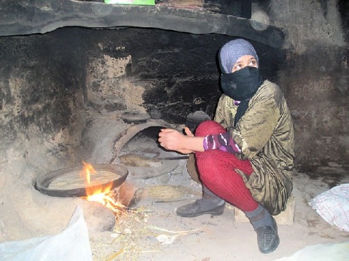 Next we visited a Berber family for tea and homemade bread. The eldest daughter, confined to hard work, sat in a smoked filled kitchen, only her eyes visible through the head covers. After a three-year marriage her husband had divorced her because she could not conceive, thus dishonoring her family. We watched her chop the vegetables, place them in between two pieces of rolled-out dough, and bake it in a flat pan over an open wood fire. While waiting for the pizza we visited with her mother over tea, walnuts, almonds and fresh bread dipped in olive oil and honey from mountain flowers. All was delicious, including the pizza.