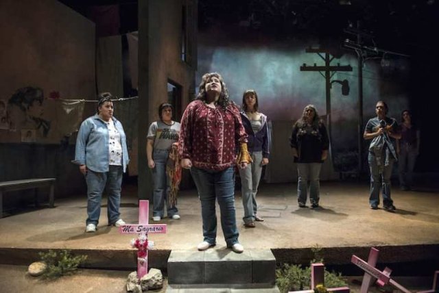 Two mothers—Marisela (Charin Alvarez) and Yolanda (Sandra Delgado)—are the heart of the story as they mourn their losses and yet hope their daughters will return. As the play begins in 1998, Mari’s daughter Rubi has been gone for two years. Late in the play, Mari is in the street, protesting police and government failures. She wears a dress of handmade posters about Rubi’s death.