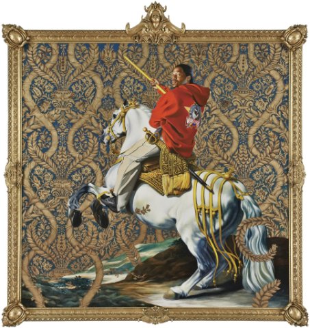 You enter the exhibit through tall black iron gates. Atop them is a tiny Klux Klux Klanner, who loomed large over the black community in the United States. Immediately inside the exhibition area is a tall wall of packed cotton. In recent memory, people like Tinee and Marsh Richardson in Yellow Bluff, Alabama, still picked cotton on Peyton Burford's plantation. Now machines have replaced them. Yet cotton remains at the heart of the black experience in America. Through a doorway, a take on Diego Velasquez' Count Duke Olivares shines in bright colors. A black man sits in the saddle now, his uniform full of color. Nike is prominent too.