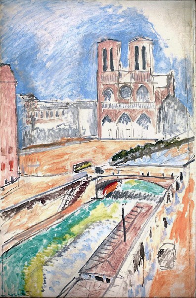 A cheat sheet of where he was going is provided by four views of Notre Dame Cathedral. The first, from 1900, is conventional and not very compelling in its naturalism. There is a kind of midpoint watercolor study from 1914 then the MoMA masterpiece of 1914. The form of the cathedral is reduced to basic linear shapes. Then simple lines represent the diagonal of the embankment by the side of the Seine, and another horizontal line, with a curve below it, identifies a bridge.