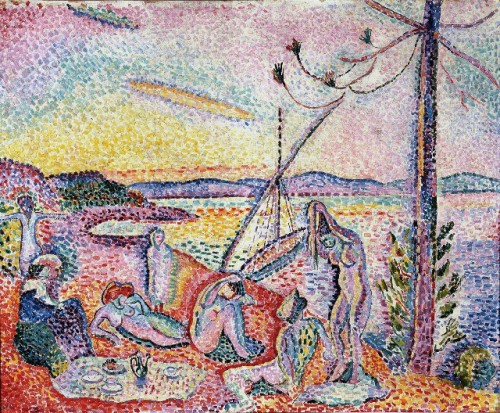 In "Luxe, calme et volupte" we see Matisse exploring the pointillism of George Seurat with the looser more broken technique of Paul Signac.
