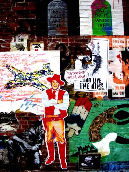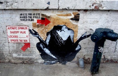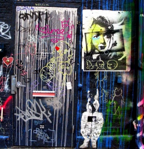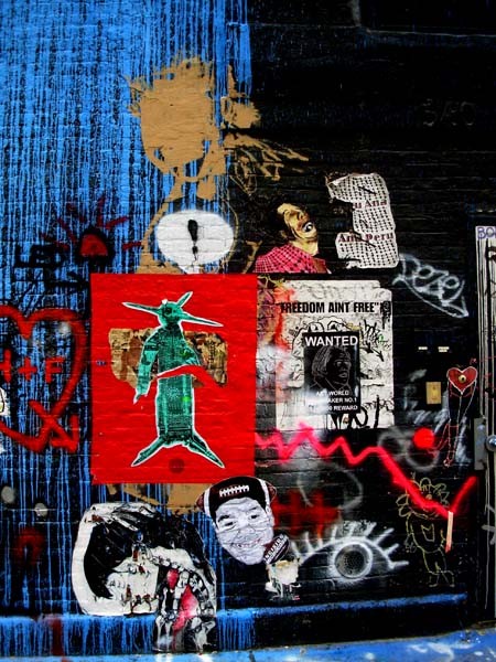 We encounter a vertsion of the Exquisite Corpse in street art and grafitti as the next anomymous person adds to or alters the prior text or image. There is a sense of sport and play. In another sense it is blight and vandalism. An orderly society prefers to remove and delete this blot on the urban landscape.