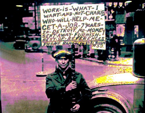 We include in this portfoilo an altered state of a documentary image from the Depression of a man with a hand made sign looking for work. The text is all too vividly like what is now going on in America as millions have lost jobs and life savings. The image becomes less historic and nostalgic and all too real and contemporary.