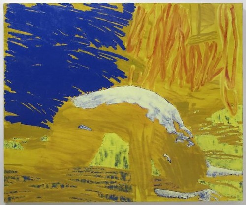 The figure in the painting is a muddied totality of it all and his body no longer bears the weight. He is fallen to such an extent that it implicates each one of us, while as a society we are all the more culpable for allowing such wholesale slippage to occur in our midst. Few amongst us would note this one’s plight for he is so far sunken, more of soil than flesh, a mere mound of ochres and raw umbers that hint only minimally at a presence. While the forces dragging him low seem nearly gravitational, as if from the inward collapse of some existential black hole, what keeps him there is the crushing tide of the world around him which crashes-in at his back in broad and abrupt strokes of blue. America is not one for lifting its fallen, preferring they languish for the long, slow fade; on his own, the figure in On All Fours #3 will not be standing anytime soon.