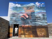 By: - May 30th, 2024In the spirit of the centennial of Surrealism Rafael Mahdavi has created a mural on an exterior wall. "The wall for the mural is part of a friend’s house on the Cycladic Island of Paros. I spend my summers there. I first met Frank at my first solo painting show in NYC at the Tibor de Nagy Gallery in 1973. Frank and I stayed in touch, he liked my work. Last year he commissioned the mural. Seven by seven meters."