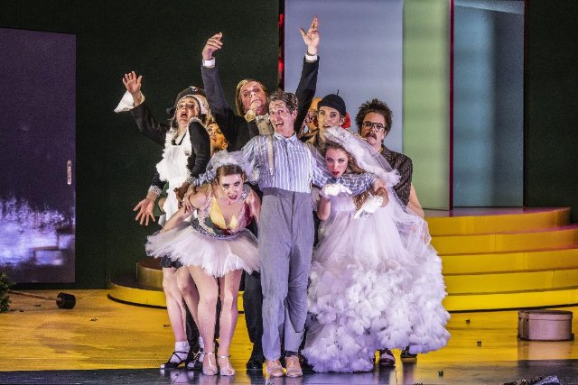 The stage setting by Herbert Fritsch was stark but framed by many differently colored doors that constantly had people come out of and go back through again. Populated by a most colorful array of people in beautiful costumes, outfits of past centuries (by Geraldine Arnold), one had to watch carefully for the next twist in this fast-paced performance of singing and dancing. This work is part of the new festival coined Schall&Rausch (sound and indulgence) of this opera house.