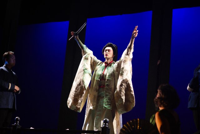 Production values in M. Butterfly are superb. Randy Wong-Westbrooke’s scenic design draws from Chinese black lacquer-work. Mimicking lacquer screens, three concentric black arches with gold designs frame the proscenium, with slick black steps and other angular features dominating the stage. Michael Oesch’s often stark lighting highlights the action, while Keiko Carreiro’s costumes stand on their own and provide sharp contrast with the background. Often, stage wigs can look very phony, but Alexander Class’s wigs for Song are most appropriate. Final kudos go to James Arp for his sound design which joins the divergent elements of the Asian and Western elements.