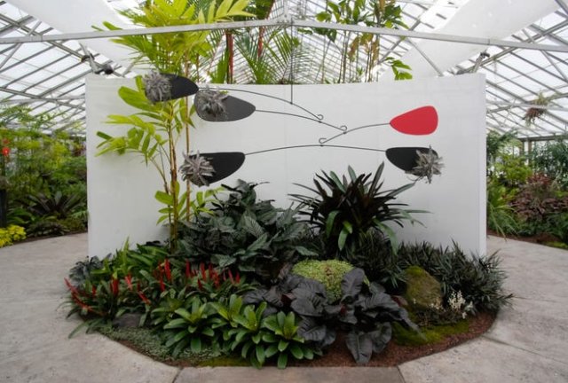 In the greenhouse conservatory, you’ll find a half dozen “vignettes” that both echo and expand on Calder’s work, incorporating natural rock, heavy gauge steel wire, water elements and plants selected for their colors, sizes and shapes, from orchids to bonsai. One even includes red goldfish as moving accents. (A soundtrack of John Cage music that plays in the background is the perfect accompaniment.)
